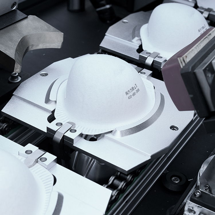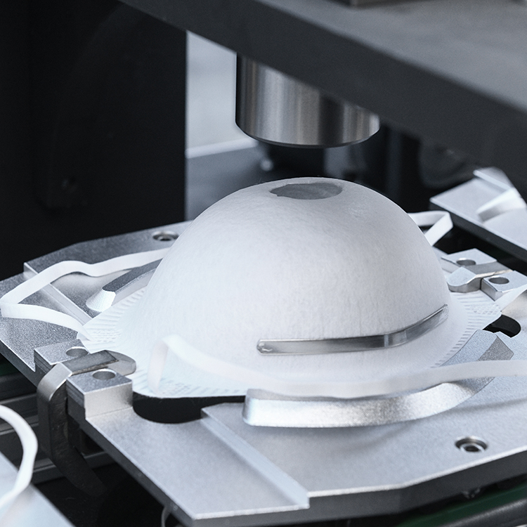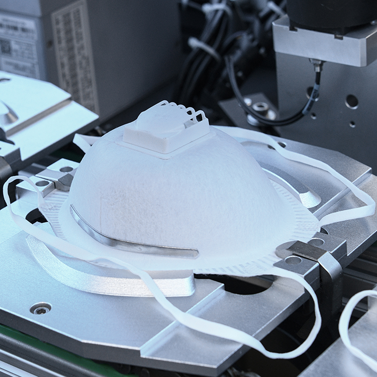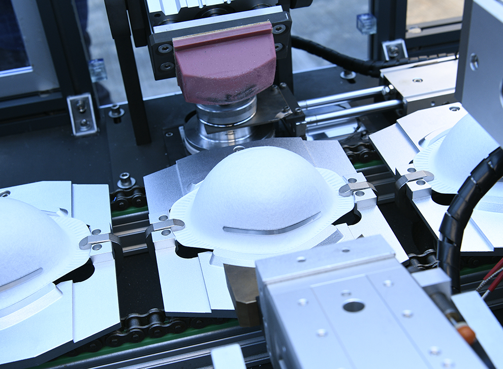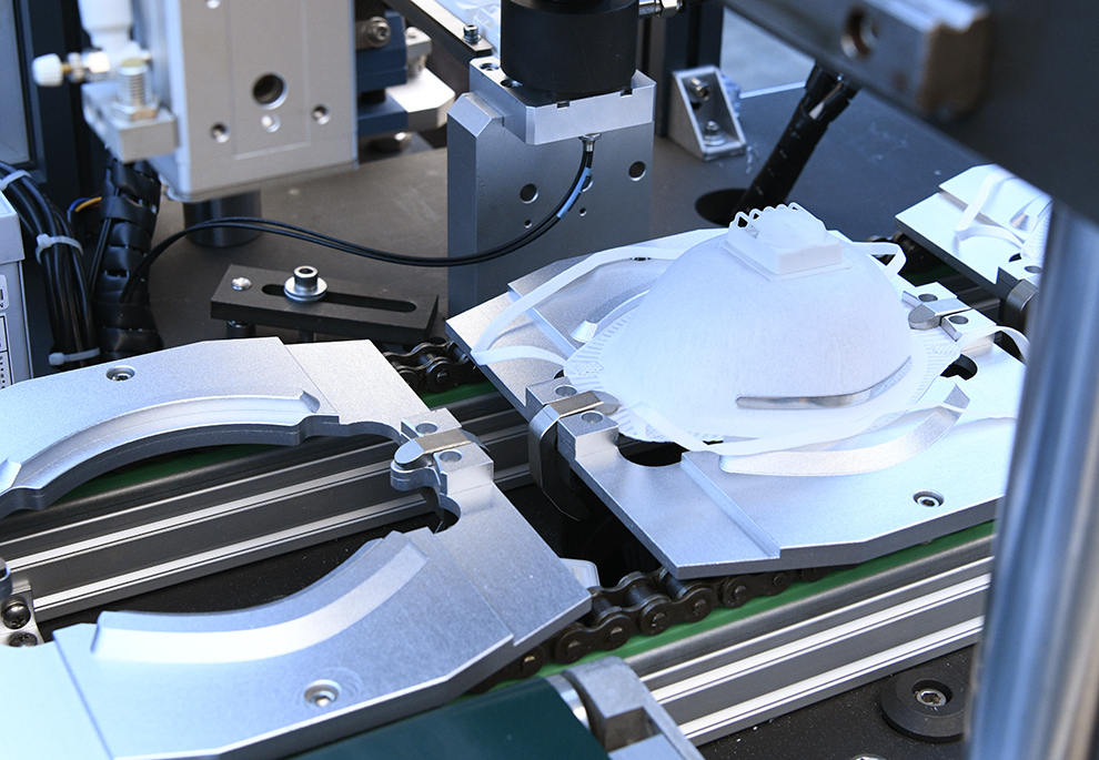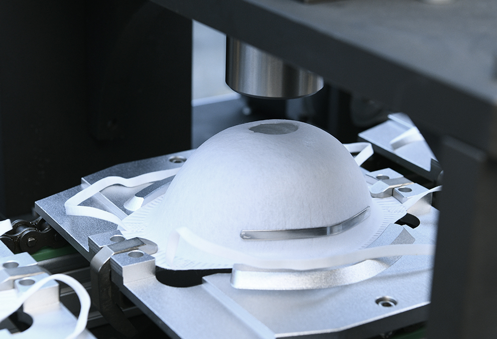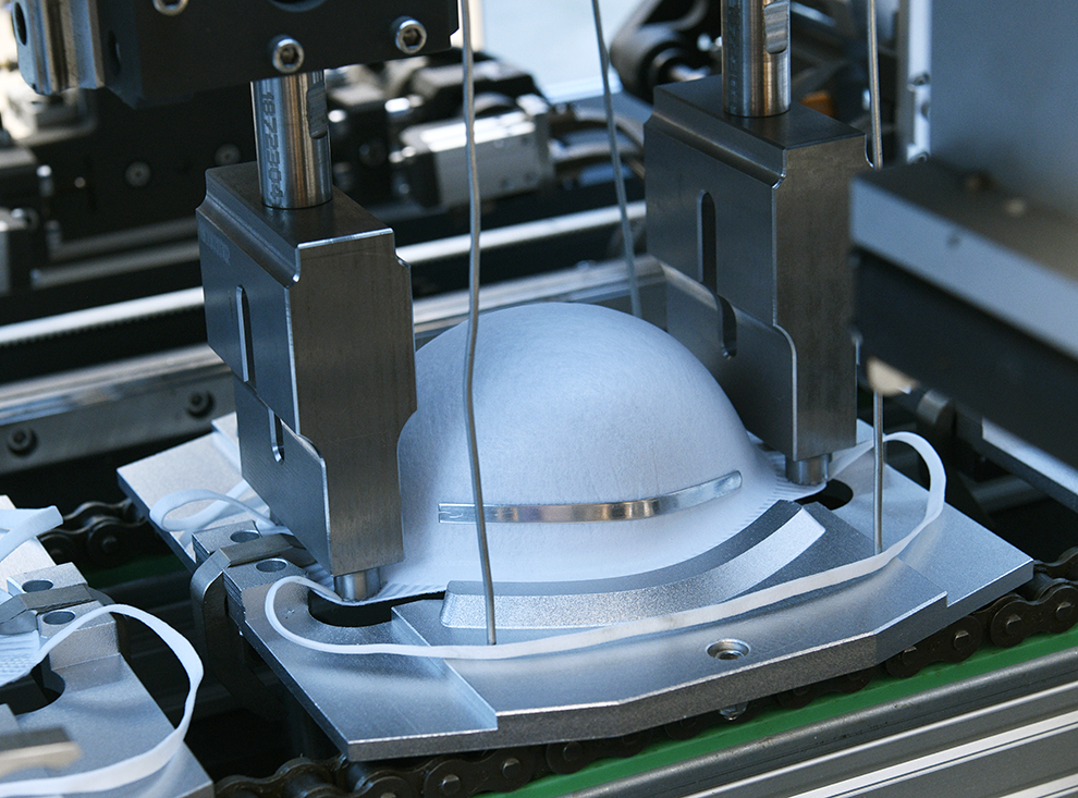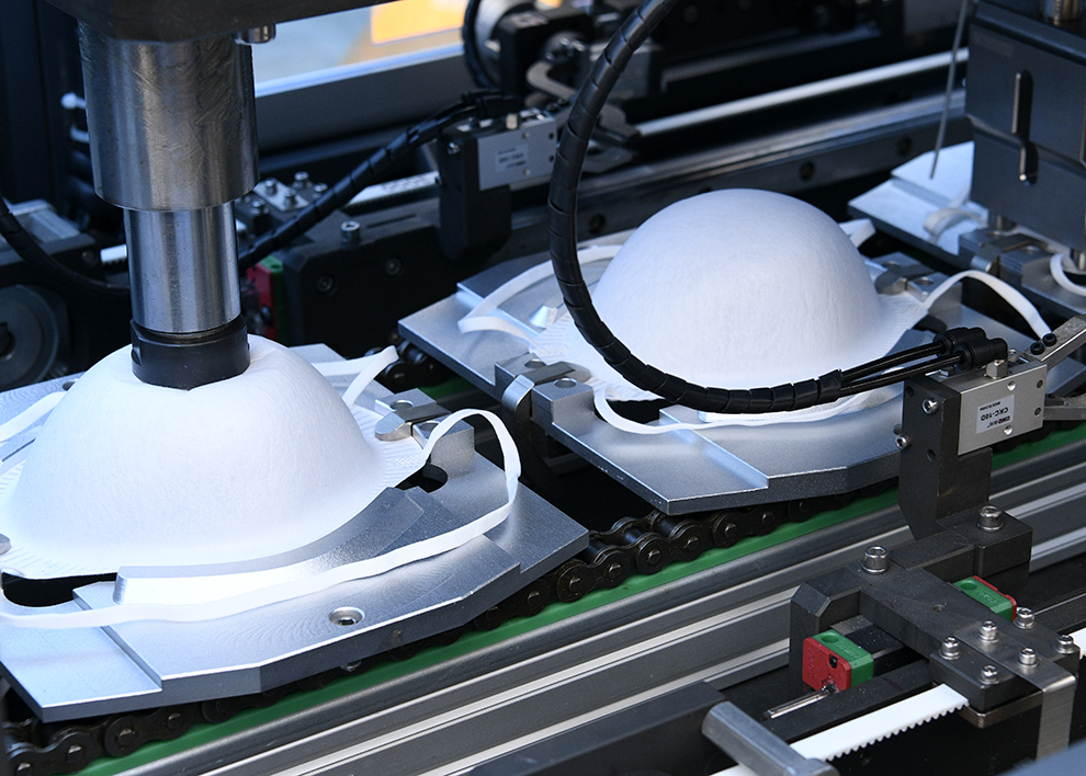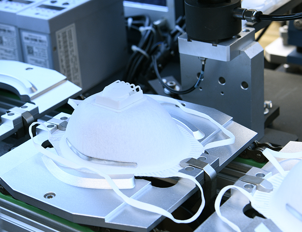 設備自動送料、熱貼鼻梁條、移印、焊耳帶、沖呼吸閥孔、自動上呼吸閥、自動焊接呼吸閥、自動出料堆疊等工序。
